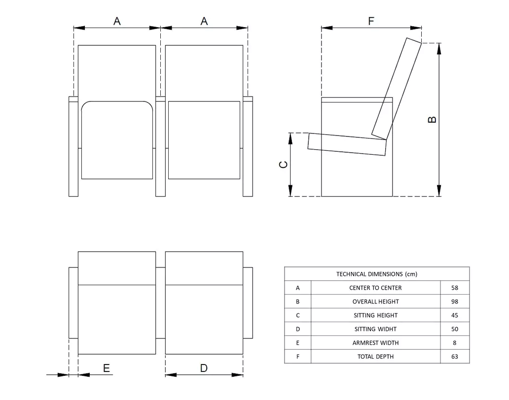 Estetik ahşap kolçaklarıyla klasik tiyatro salonlarına şıklık kazandırır. Yanmaz kumaş döşemesi ve ergonomik yapısı sayesinde uzun oturumlarda konfor sağlar. Projeye özel renk ve vernik seçenekleriyle özelleştirilebilir.