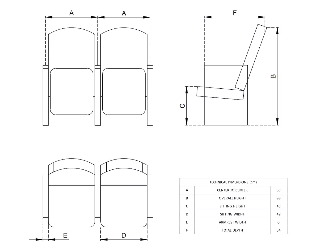 Plastik sırt desteği ile dayanıklılığı artırılmış bu model, yoğun kullanıma uygun olarak tasarlanmıştır. Katlanır oturak yapısı sayesinde yerden tasarruf sağlar. Yanmaz kumaş veya deri kaplama seçenekleri mevcuttur.